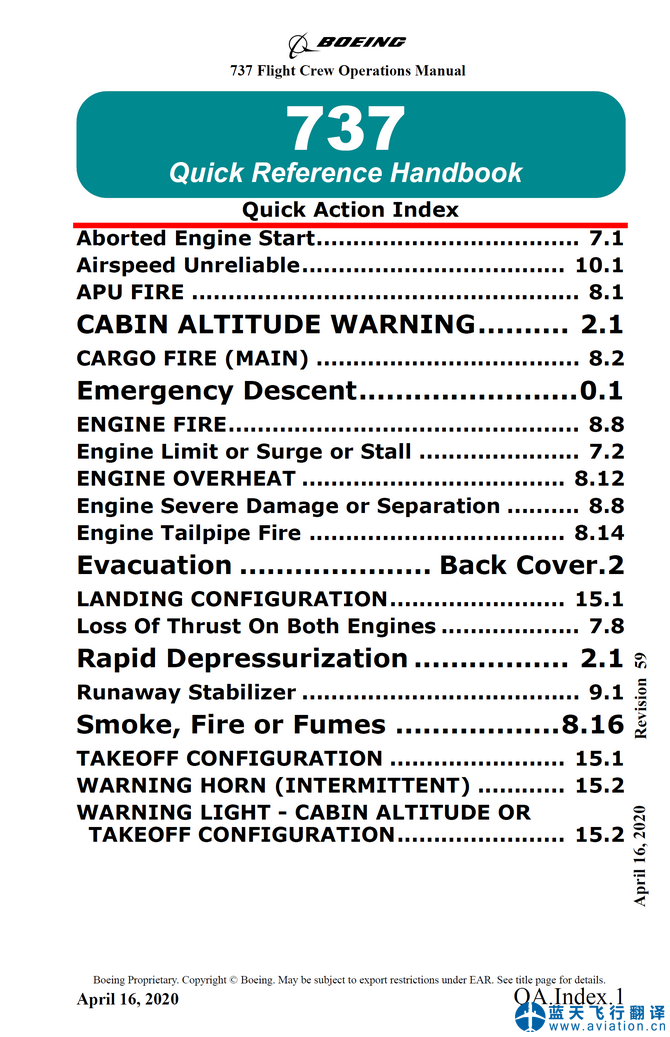 北京藍(lán)天飛行翻譯公司本次翻譯的737-800飛行機組使用手冊、快速檢查單和飛機飛行手冊修訂日期為2020年4月16日,總共包含62架飛機。
